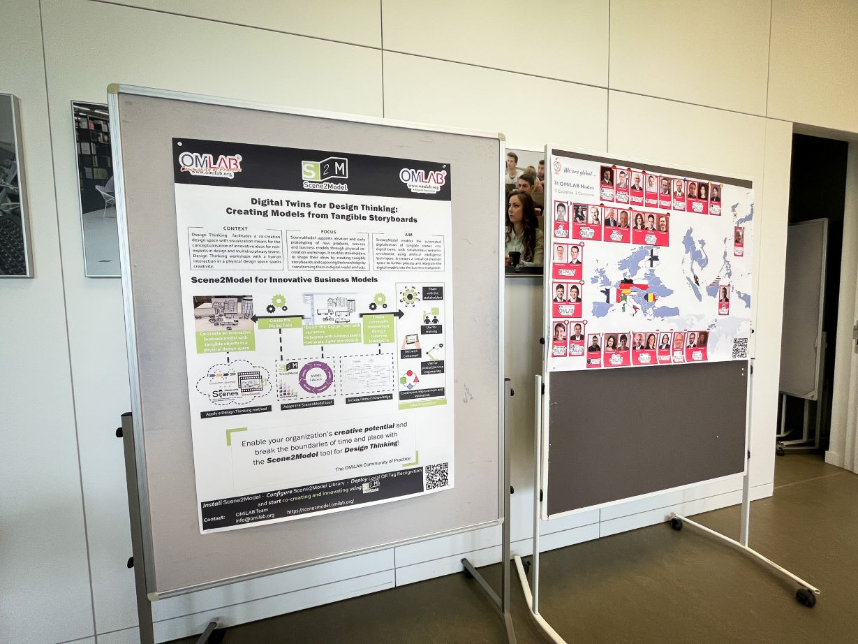 The newly established OMiLAB node at the University of Applied Sciences and Arts Bielefeld - OMiLAB@HSBI, welcomes participants at the International Week in the lab for a showcase of the Digital Innovation Environment starting with the Co-Creation layer of Design Thinking with Scene2Model, moving to model-based interactions with a Robotic Arm and mBot generating model-value in different scenarios!